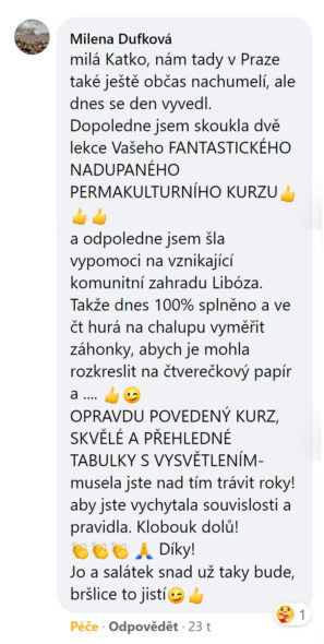 Krásný den Kateřino, Blahopřeji k ocenění Udržitelné podnikání. Díky Vám naše zahrada doznala změn. Každý rok přibude záhon. Příští rok bychom chtěli udělat bosochodník skrz zahradu mezi záhony. No, zatím je to jen v hlavě, tak uvidíme 😀 Děkuji za kurzy. Zvláště ten poslední Moje rajská zahrada, který mě držel na zahradě zase o něco víc. Příští rok bych podle něj opět pracoval. Krásně mě vede. Přeji Vám Veselé Vánoce a do nového roku hodně štěstí, zdraví a hlavně žádné drobky v čaji S přáním krásného dne Lukáš